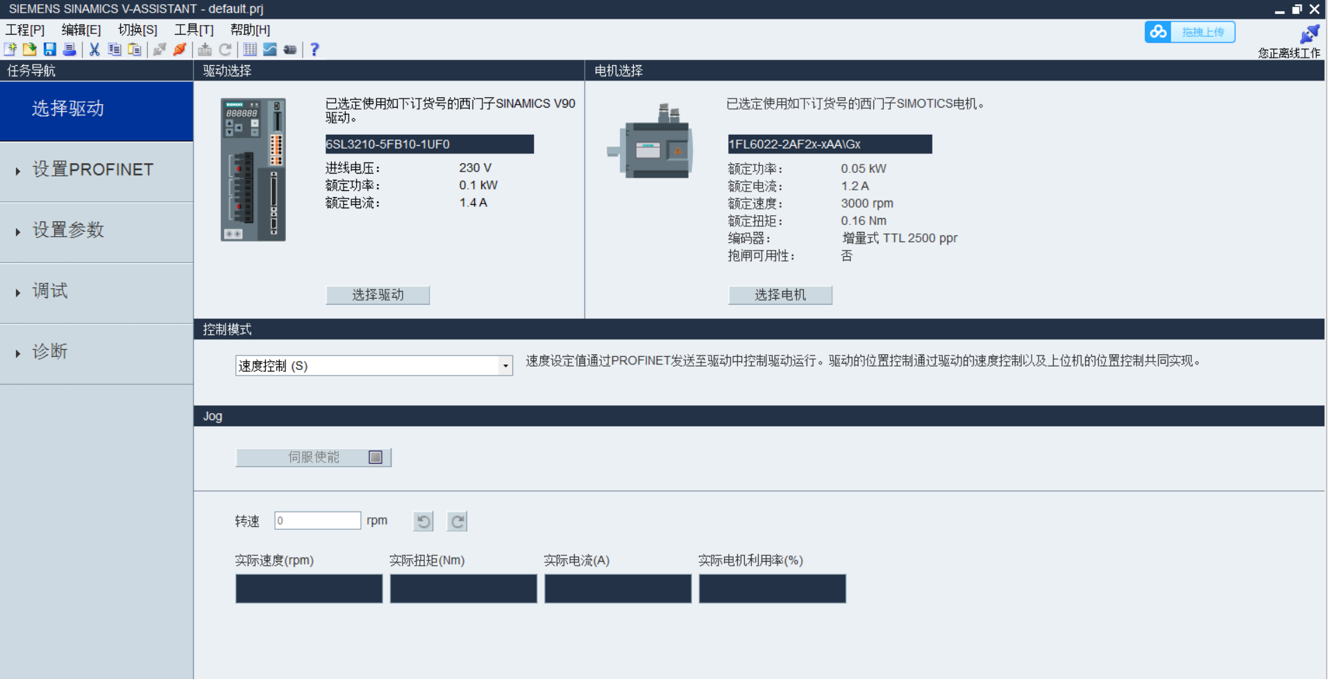 离线模式:SINAMICS V-ASSISTANT 不与任何已连接的驱动通讯。 有两个选项可供选择: